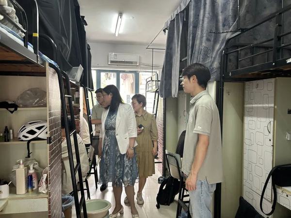随后,周春娟一行深入暑期留校学生宿舍园区,细致地了解学生暑期住宿、饮食等情况,提醒同学们要严格遵守宿舍管理规定,重视寝室用水用电的安全;要强化防诈防骗意识,切实保障个人财产安全,鞠恒荣鼓励同学们要充分、合理的利用假期时间,多读书、多思考、多实践。