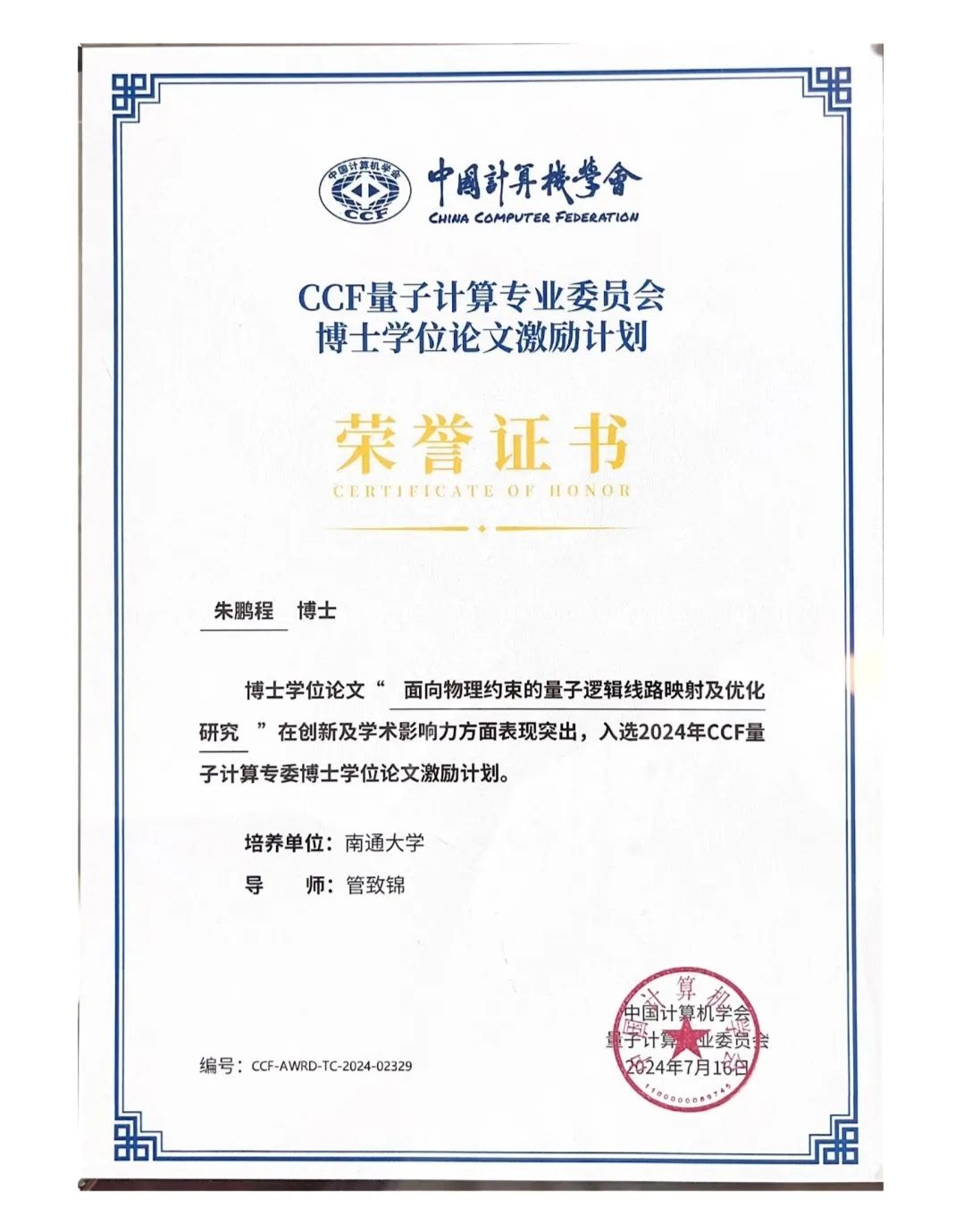 近日,2024年度“CCF量子计算博士学位论文激励计划”评选结果及入选名单正式揭晓。yl6809永利集团2018级博士研究生朱鹏程(导师:yl6809永利官网集团 管致锦教授)论文《面向物理约束的量子逻辑线路映射及优化研究》入选激励计划。