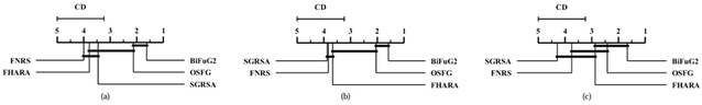 Fig. 4. CD diagrams comparing the classification accuracy of different algorithms: (a)SVM, (b)KNN, (c)RF classifier.