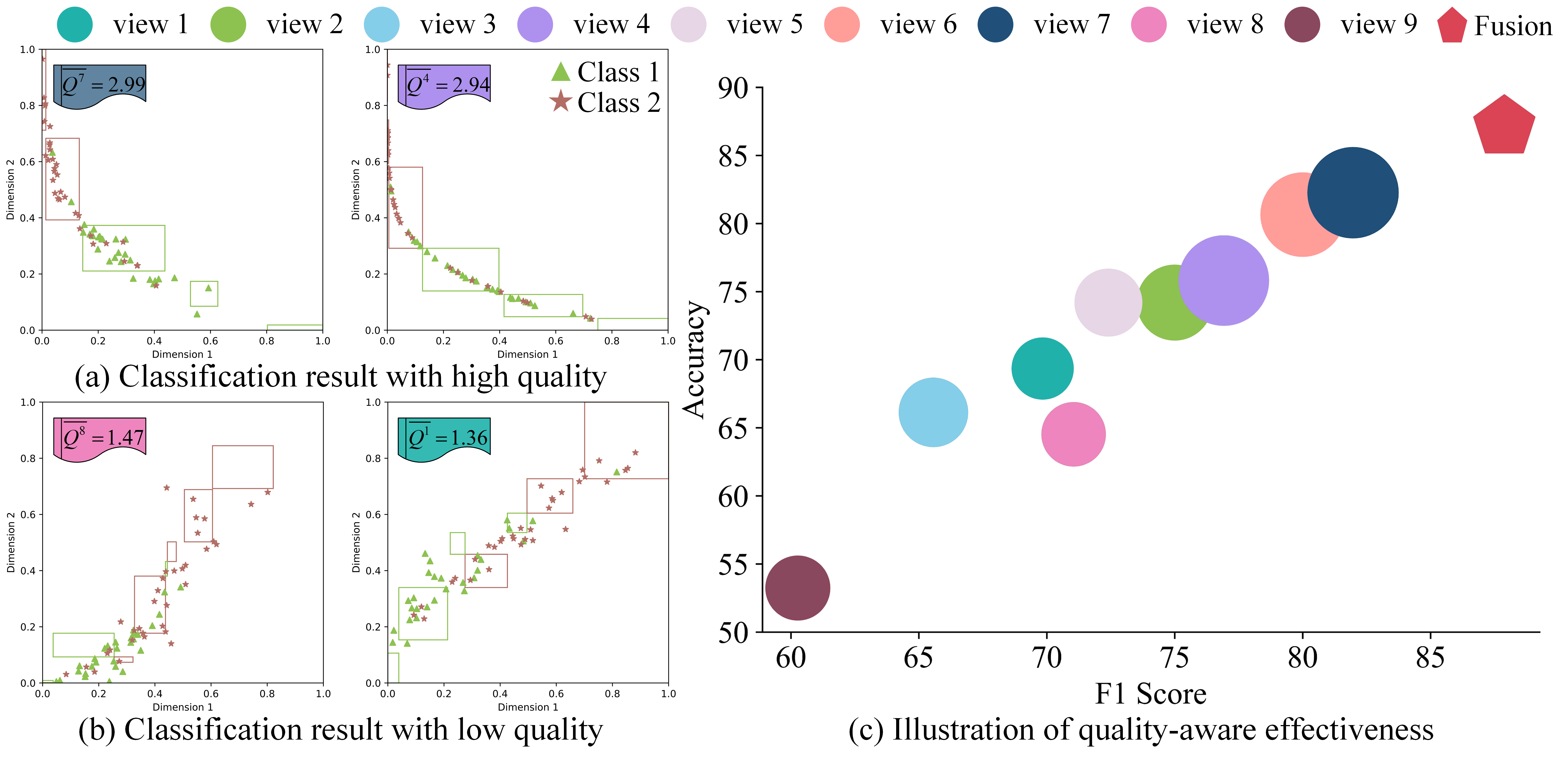 Fig 2. Classification results of MFMM with high (a) and low (b) quality. The size of the points (c) is associated with the average dynamic quality-aware weight of all samples, and the larger points correspond to higher quality, and vice versa.