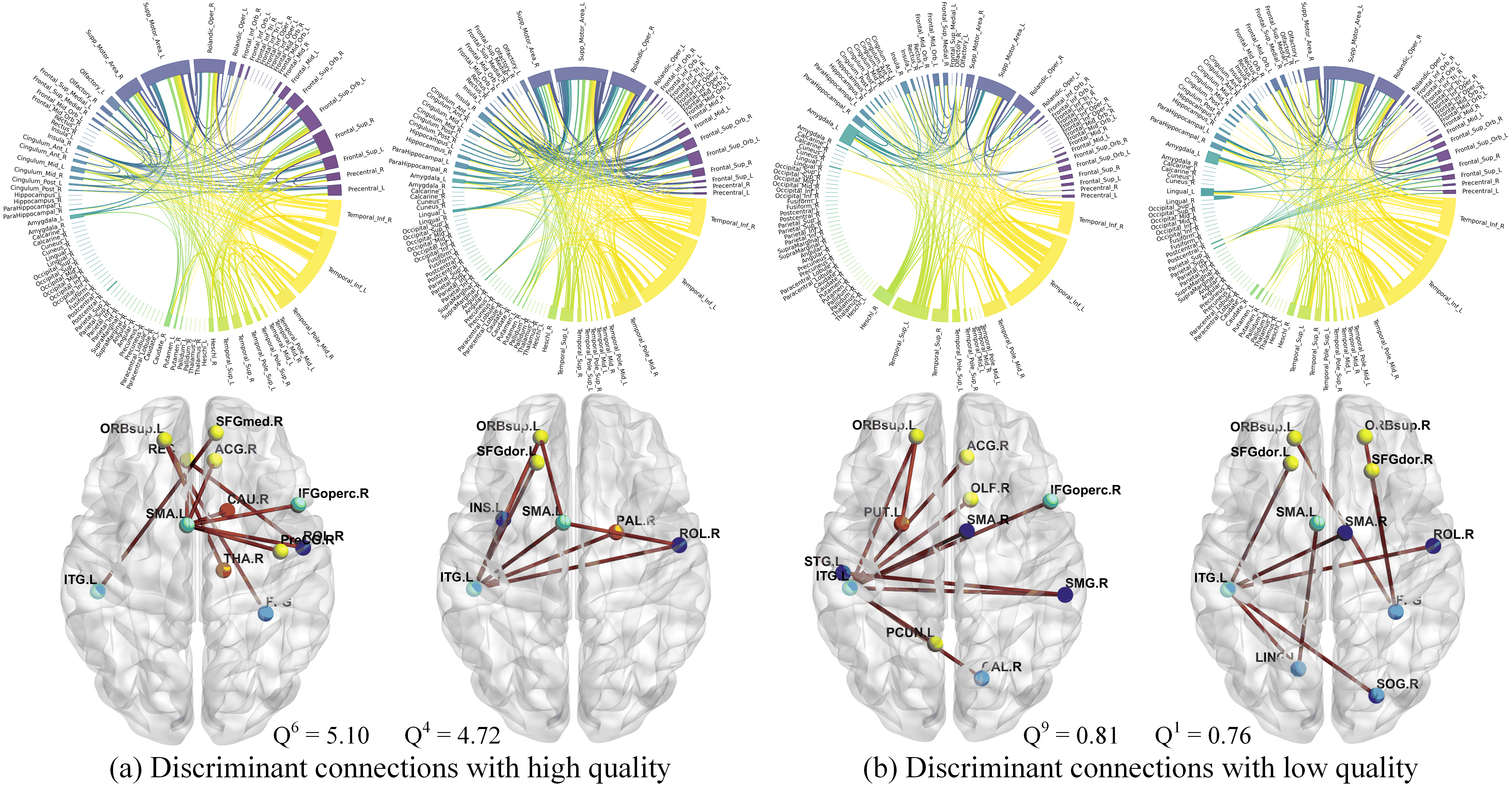 Fig 3. The first row shows the discriminative connections, and the second row illustrates the map of the brain regions corresponding to the strongest connections.