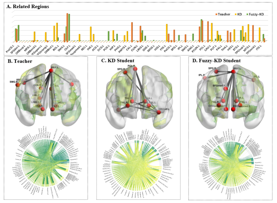 Fig. 3. Discriminative connections and brain regions selected by the teacher model, KD student model, and fuzzy-KD student model.