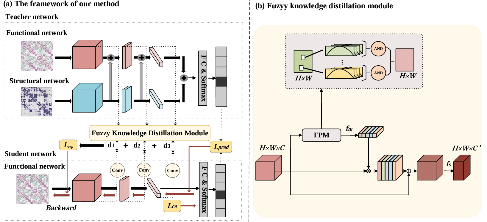 This paper proposes a novel fuzzy knowledge distillation (fuzzy-KD) model for brain network analysis of incompletemulti-modality data. Specifically, we design a fuzzy-KD module to reducethe information gap between the teacher and student models