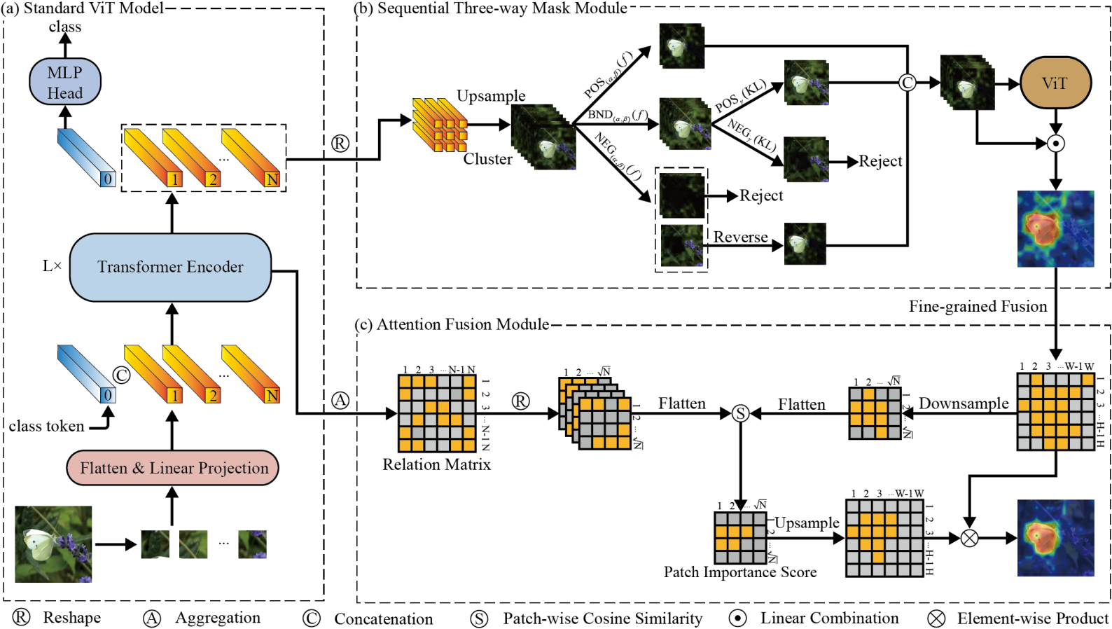 Attention Fusion module: The AF module refines the coarse-grained interpretations generated by the S3WM module. First, it calculates a relation matrixR, capturing global image block relationships by aggregating attention across different encoder layers and heads in a Transformer model. The module then calculates the importance scoreP, for each image block based on its cosine similarity to the preliminary interpretation resultS. These scores reflect the correlation between the image block and object-position data. Finally, the AF module fuses the importance scores with S to generate a more fine-grained importance mapV.