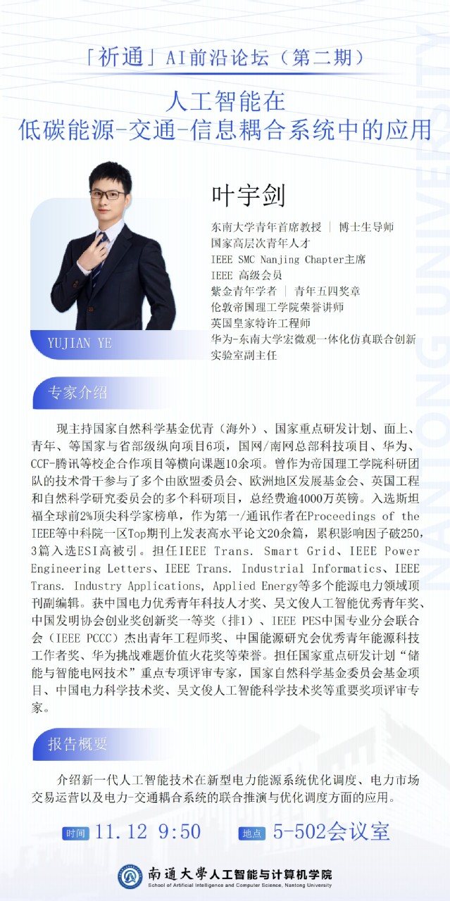讲座预告 | 叶宇剑:人工智能在低碳能源—交通—信息耦合系统重的应用