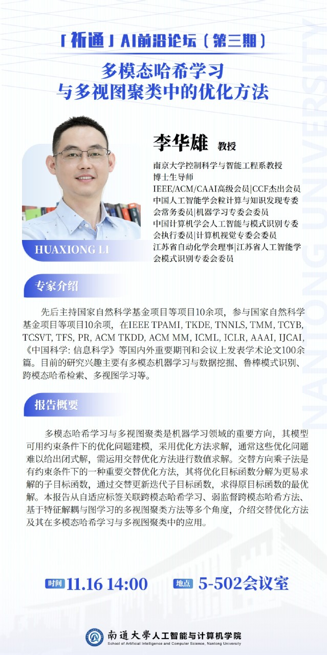 讲座预告 | 李华雄:多模态哈希学习 与多视图聚类中的优化方法