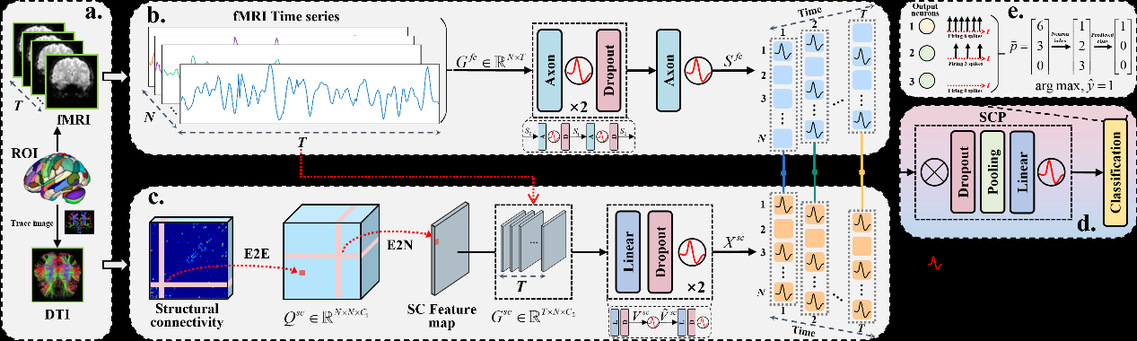 大脑结构连接(SC)和功能连接(FC)之间的耦合(SC-FC耦合)是大脑信息处理与功能整合的关键机制,其异常与多种脑疾病的发生和发展密切相关。现有的SC-FC耦合分析方法主要侧重于揭示SC和FC拓扑模式之间的统计关联,但往往忽视大脑中神经生物学机制。本研究提出了一种用于理解脑网络SC-FC耦合关系的脉冲神经网络(SCNNs),通过脉冲神经元和突触权重的密集互连来模拟大脑中SC和FC的相互作用,并利用脉冲时序和网络活动特性来量化SC-FC耦合。提出的方法在真实癫痫数据集上的实验不仅证明了SCNNs在脑疾病诊断方面的卓越性能,而且还为SC-FC耦合分析提供了新视角。
