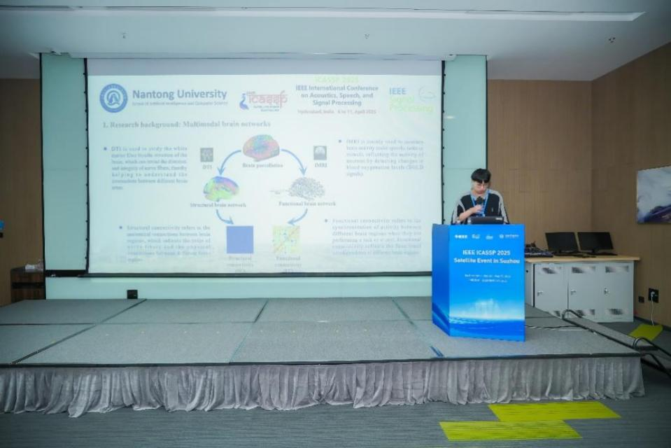 近日,2025年IEEE声学、语音和信号处理国际会议(IEEE International Conference on Acoustics, Speech, and Signal Processing,ICASSP)卫星会在中国苏州中国计算机学会总部隆重召开。我院2023级硕士研究生魏少龙、苏展应邀参加会议并做学术报告。其中魏少龙同学以“SCNN: Spike Coupling Neural Network for Multimodal Brain Network Analysis”为题,与来自北京大学、华盛顿大学的优秀学者同台汇报,系统阐述了基于脉冲神经网络架构模拟脑网络中结构连接与功能连接交互关系的方法与研究成果,围绕多模态脑网络分析领域的前沿问题展开了深入交流。