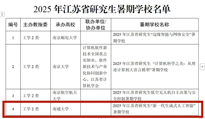 近日,2025年江苏省研究生暑期学校名单公布,我校yl6809永利官网集团“2025年江苏省研究生‘新一代生成人工智能’暑期学校”成功获批并立项。