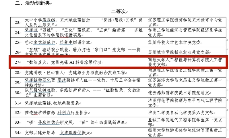 近日,根据《省委教育工委关于做好2023—2024年度高校党建工作创新案例申报工作的通知》(苏委教组函〔2025〕9号),我院报送的《数智星火:党员先锋AI科普燎原行动》荣获2023—2024年度江苏高校党建工作创新案例(活动创新类)二等次。