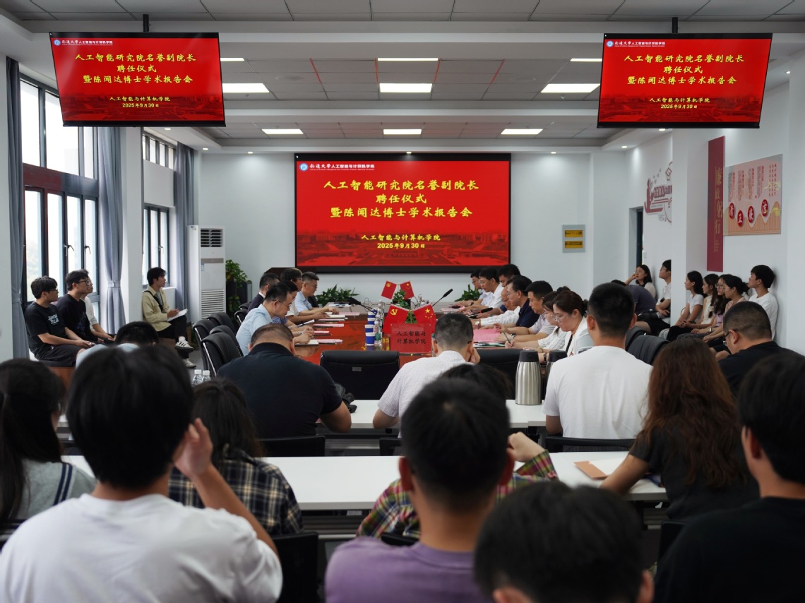 9月30日下午,我校举行人工智能研究院特聘名誉副院长聘任仪式。南通市人大常委会副主任、南通市经济技术开发区党工委书记、南通创新区党工委常务副书记保德林,南通市经济技术开发区党工委委员、组织部部长王文圣、人才科技局局长曹永红、人才科技局副局长程李荣、人才科技局科技处处长王赟翀出席仪式。校党委书记杨宇民出席仪式并为人工智能研究院特聘名誉副院长陈闻达博士颁发聘书、佩戴校徽。校党委常委、副校长施佺主持仪式。