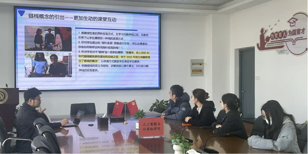 王皓晨老师结合生活化类比与递进式问题设计,将抽象数据结构具象化,融入科学精神、思维品质与职业素养等思政元素,构建以学生为中心的课堂。课后,参会青年教师围绕教学方法创新、概念具象化、课程思政融入等内容深入交流,为专业基础课教学提供了有益借鉴。本次活动有效推动教学设计创新与课堂效能提升,助力教学质量持续提高。